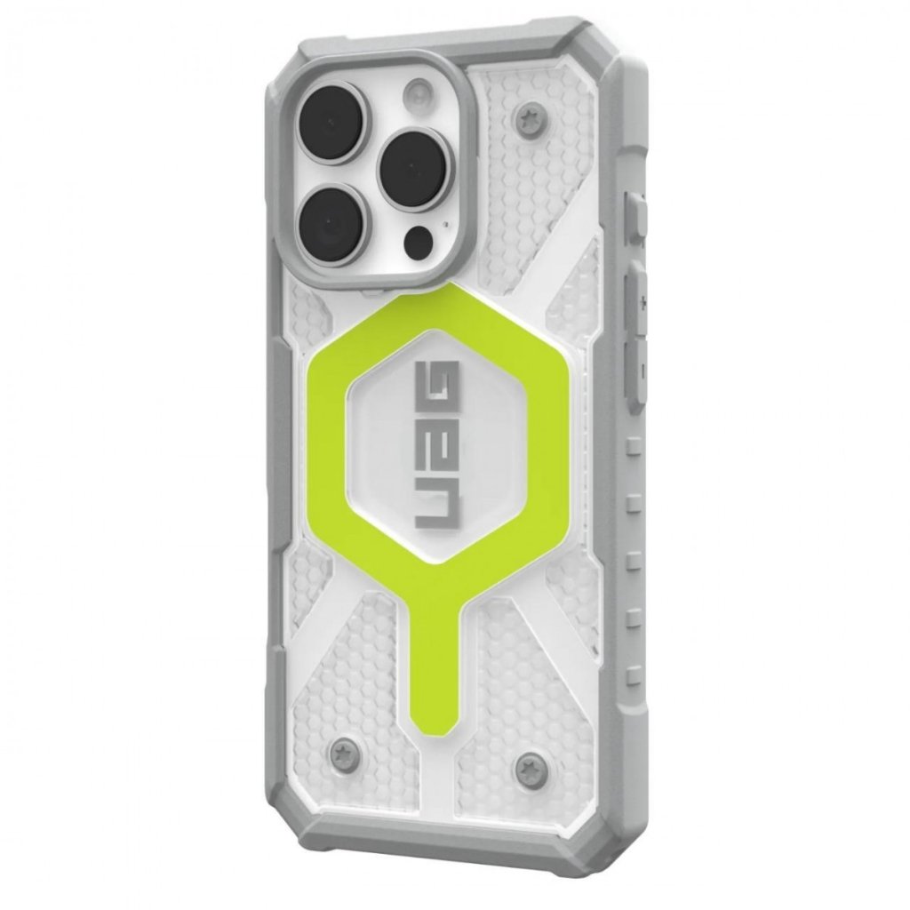 - Priehľadný dizajn: Puzdro je priehľadné, s výrazným neonovo zeleným Magsafe prstencom a logom UAG v strede.