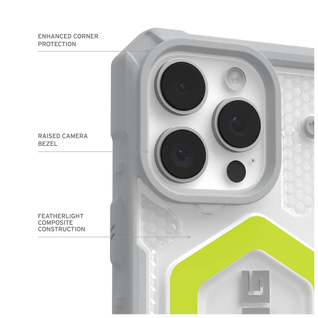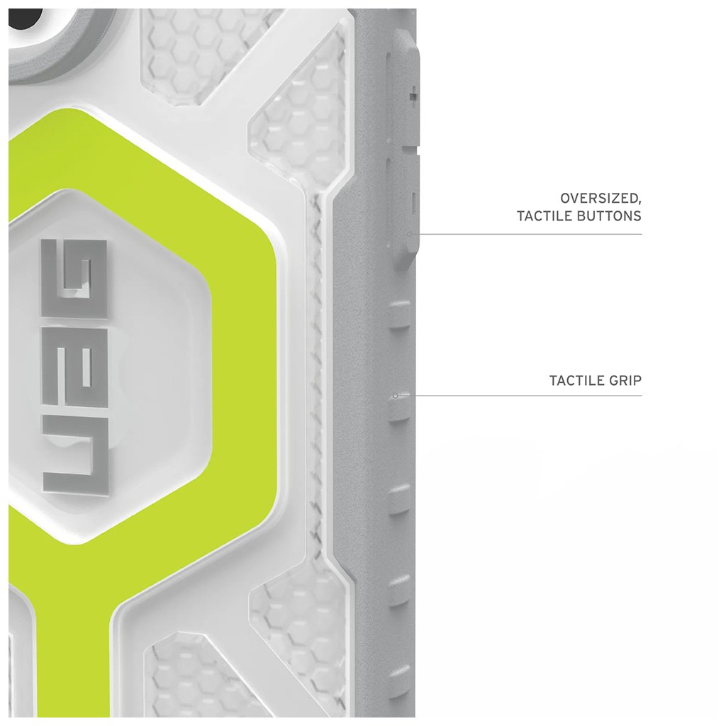 Kryt UAG Pathfinder Clear MagSafe sa vyznačuje ikonickým, industriálnym dizajnom, ktorý je pre značku UAG typický. Jeho priehľadná zadná strana s hexagonálnym vzorom pre zvýšenú absorpciu nárazov umožňuje vyniknúť originálnemu vzhľadu vášho iPhone 17 Pro, zatiaľ čo robustný šedý rám v aktívnej neonovej farbe dodáva puzdru dynamický a moderný vzhľad.