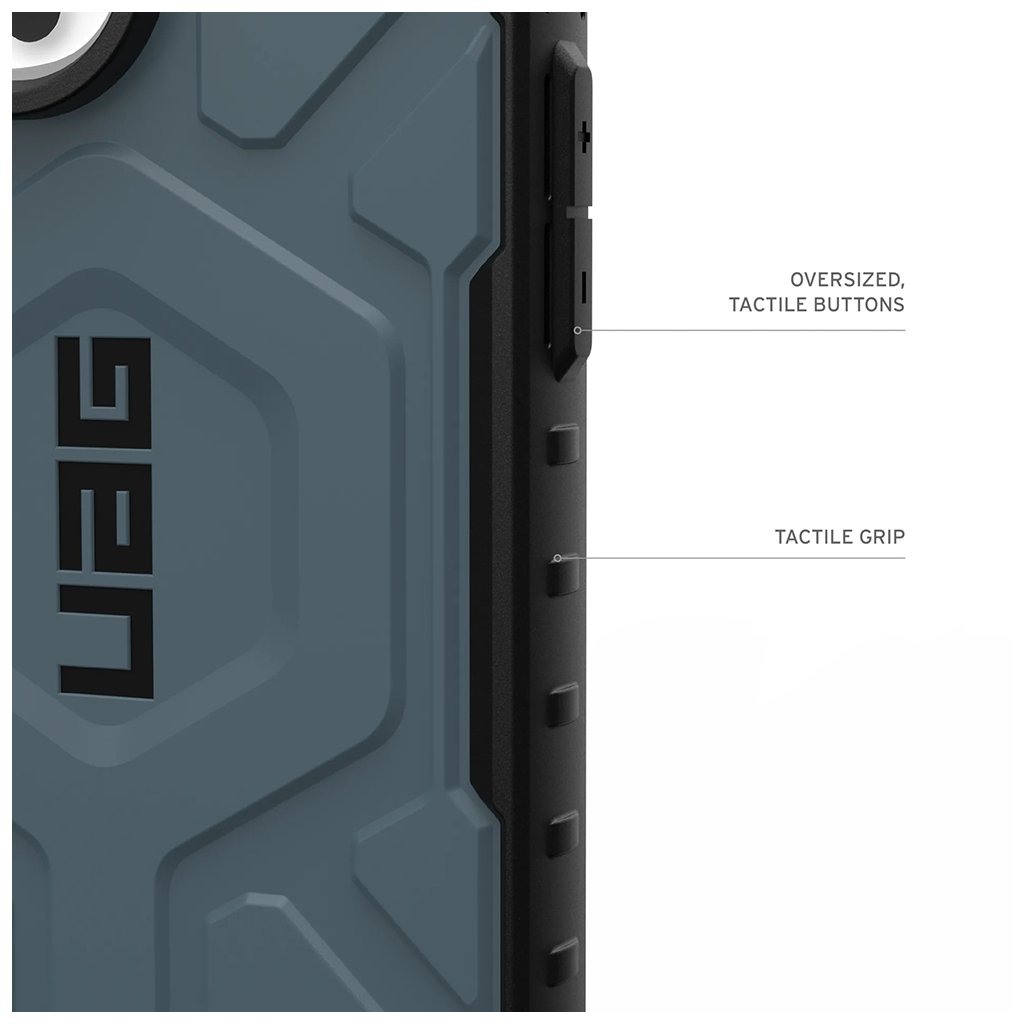 Rad Pathfinder predstavuje ikonický drsný a industriálny dizajn, ktorý je okamžite rozpoznateľný. Kryt kombinuje tvrdú vonkajšiu škrupinu z polykarbonátu s mäkkým, nárazy pohlcujúcim jadrom z TPU. Aj napriek svojmu robustnému vzhľadu je prekvapivo ľahký. Vo farebnom prevedení Cloud Blue sa snúbi tmavomodrošedý odtieň s kontrastnými čiernymi okrajmi a detailmi, ktoré evokujú vojenskú techniku. Na zadnej strane dominuje výrazné logo UAG a geometrický vzor s imitáciou skrutiek v rohoch, čo podčiarkuje jeho odolný charakter. Každý detail, od nadrozmerných hmatových tlačidiel po protišmykové úchopy, je navrhnutý pre maximálnu funkčnosť a bezpečné držanie telefónu v ruke. Integrovaná technológia MagSafe zaisťuje bezproblémovú kompatibilitu s MagSafe príslušenstvom a bezdrôtovým nabíjaním.Kľúčové vlastnosti