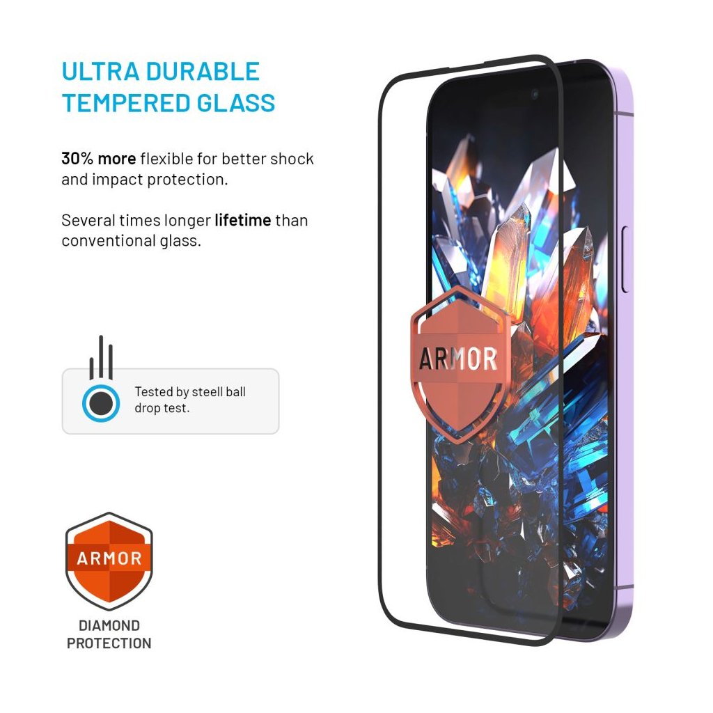 - Extra odolnosť proti prasknutiu – o 30 % vyššia pružnosť v porovnaní s bežnými sklami – chráni váš telefón pred nárazmi a pádmi.