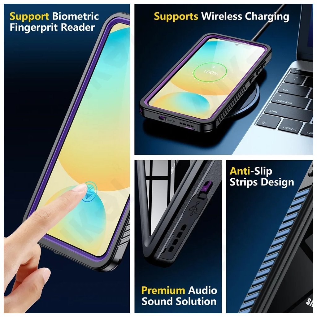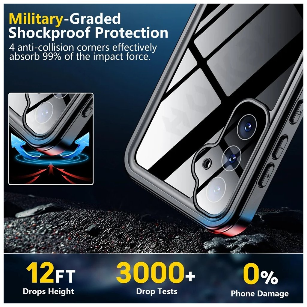 Integrovaný chránič obrazovky efektívne chráni displej pred poškriabaním a nárazmi, bez obmedzenia citlivosti dotyku alebo funkčnosti biometrického snímača odtlačkov prstov. Zosilnené anti-kolízne rohy sú navrhnuté tak, aby absorbovali až 99 % sily nárazu, čo výrazne znižuje riziko poškodenia pri pádoch z výšky až 12 stôp (približne 3,6 metra). Všetky porty a tlačidlá sú precízne zakryté, aby sa zabránilo vniknutiu vody a prachu, pričom zostáva zachovaná ich plná funkčnosť a podpora bezdrôtového nabíjania. Praktické protišmykové prúžky na bokoch zaisťujú pevný úchop a minimalizujú riziko vyklznutia telefónu z ruky. Súčasťou balenia je aj praktické pútko pre ešte bezpečnejšiu manipuláciu.