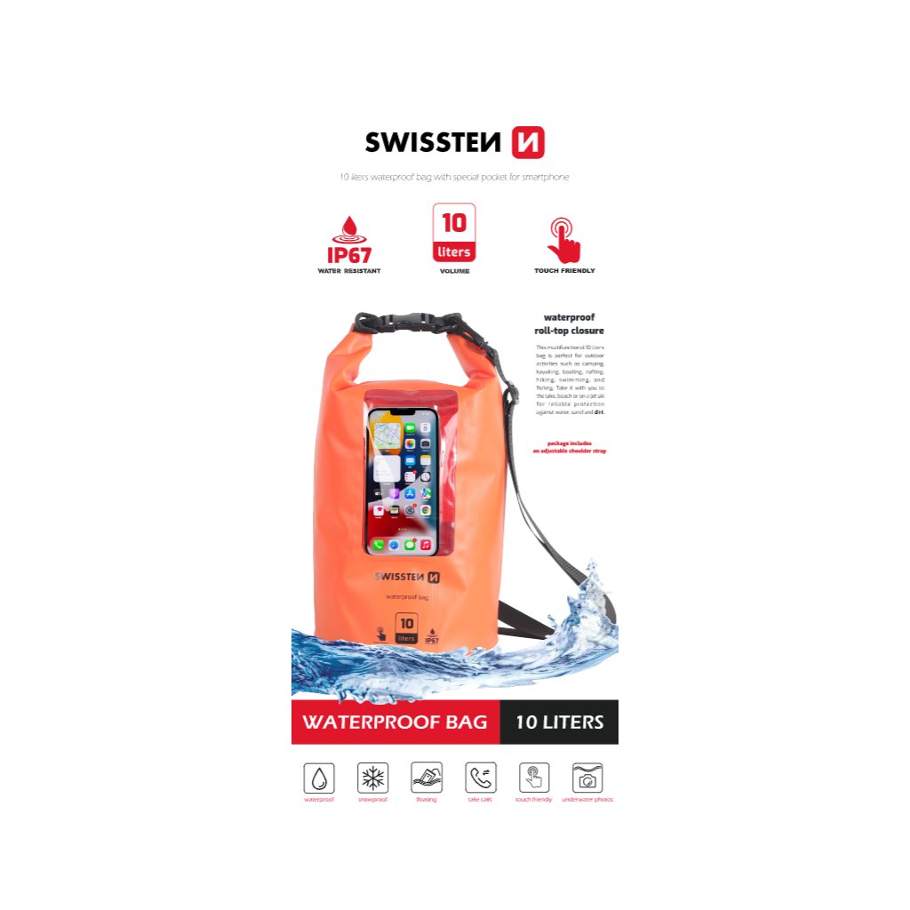 Vodotesný vak Swissten s objemom 10 litrov je navrhnutý tak, aby poskytoval maximálnu ochranu pred vodou a vlhkosťou. S vodotesnosťou certifikovanou na úrovni IP67 je ideálny pre vodákov, rybárov a všetkých, ktorí potrebujú spoľahlivú ochranu svojich vecí v náročných podmienkach.