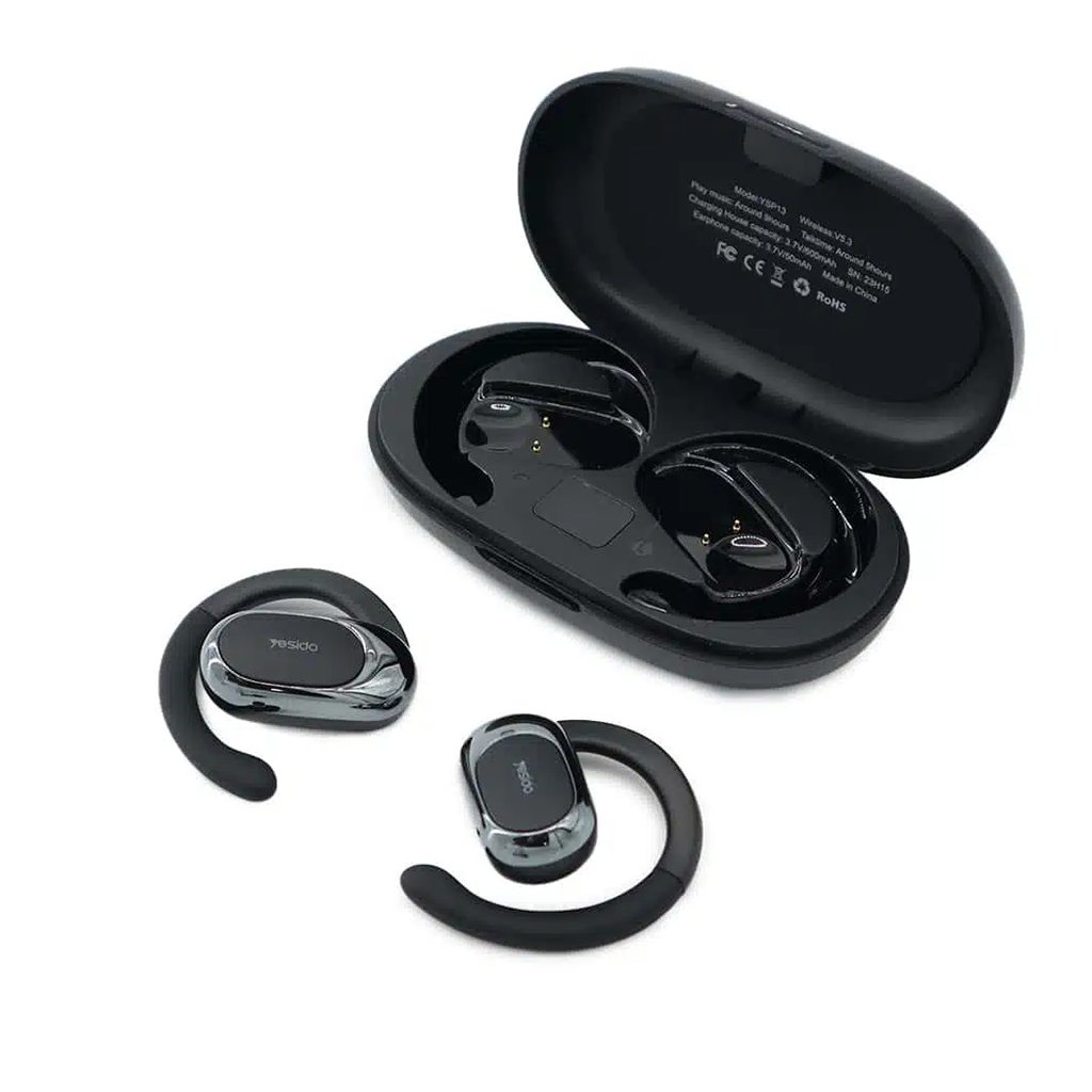 Slúchadlá Yesido YSP13 sa pýšia ergonomickým dizajnom do uší, ktorý je doplnený o praktické ušné háčiky. Tieto zaisťujú pevné a stabilné uchytenie aj počas intenzívneho pohybu, čo je ideálne pre športovcov a aktívnych používateľov. Ich elegantné čierne prevedenie s lesklými prvkami a decentným logom Yesido pôsobí veľmi sofistikovane. Súčasťou balenia je aj kompaktné nabíjacie puzdro, ktoré nielen chráni slúchadlá, ale zároveň ich udržuje vždy pripravené na použitie. Modré LED indikátory na slúchadlách dodávajú moderný vzhľad a informujú o ich stave.