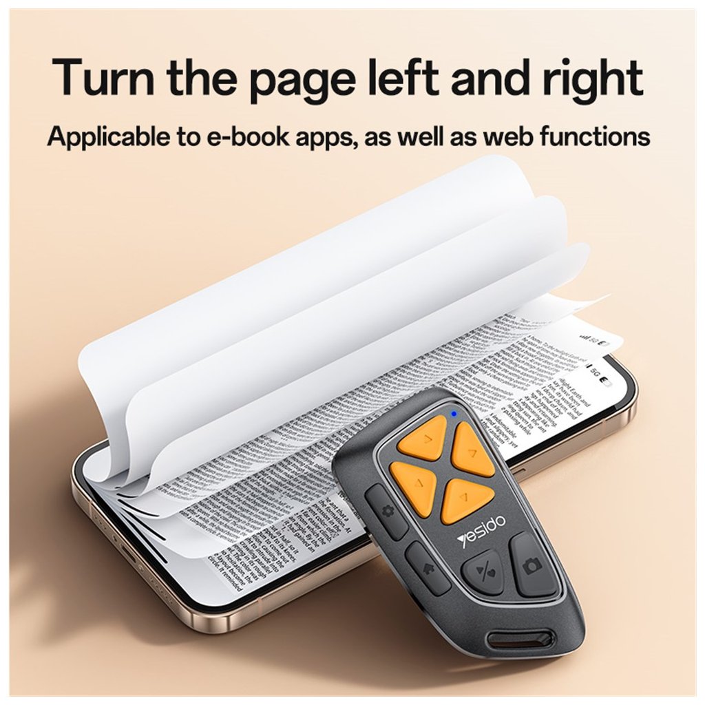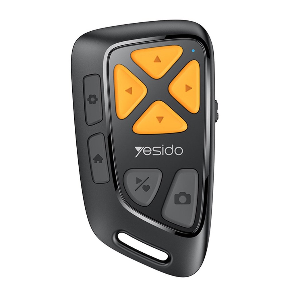 Ovládač Yesido SF25 sa pýši minimalistickým a ergonomickým dizajnom v elegantnej čiernej farbe. Jeho kompaktné rozmery zaisťujú pohodlné držanie v ruke a jednoduchú prenosnosť. Dominantou sú štyri výrazné oranžové smerové tlačidlá usporiadané do kríža, ktoré zabezpečujú intuitívnu navigáciu. Pod nimi sa nachádza trojica menších šedých tlačidiel s ikonami pre domovskú obrazovku, ovládanie hlasitosti/procent a spúšť fotoaparátu. Všetky tlačidlá sú vyrobené zo silikónu, čo zaručuje tichý chod a príjemný pocit pri stlačení. Malá modrá LED dióda signalizuje stav pripojenia. Praktické očko na spodnej strane ovládača umožňuje jeho jednoduché pripnutie na kľúče alebo pútko.