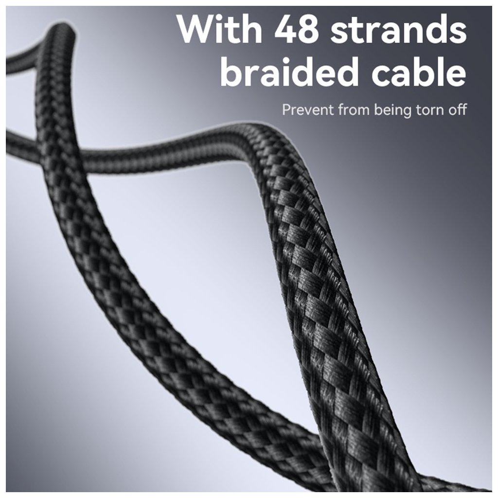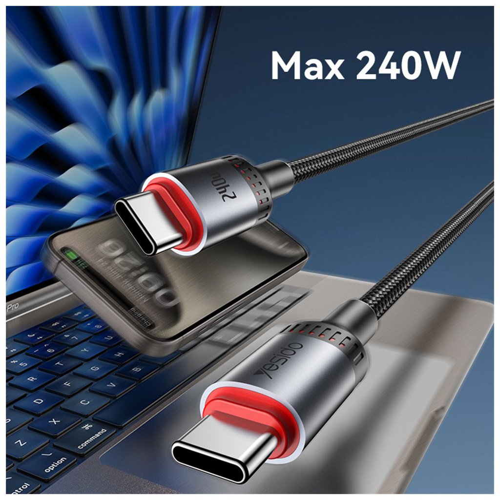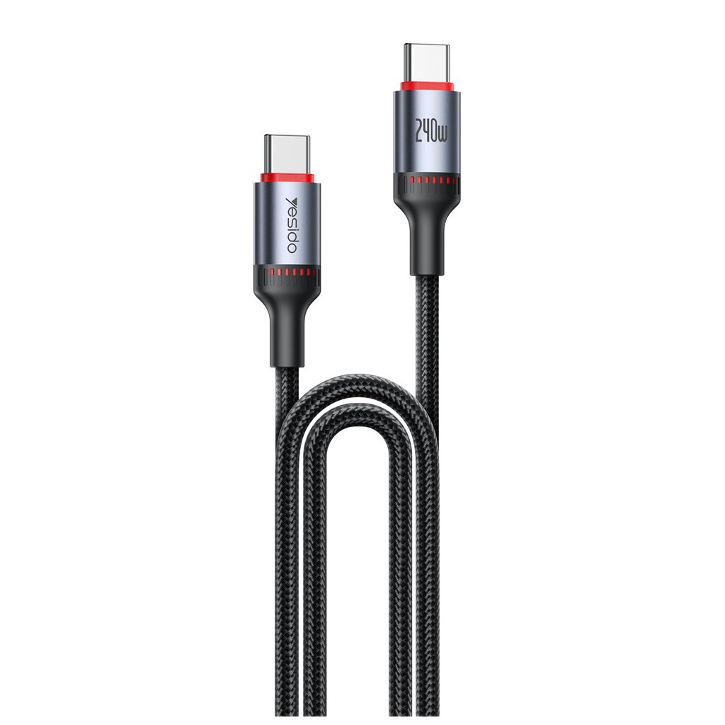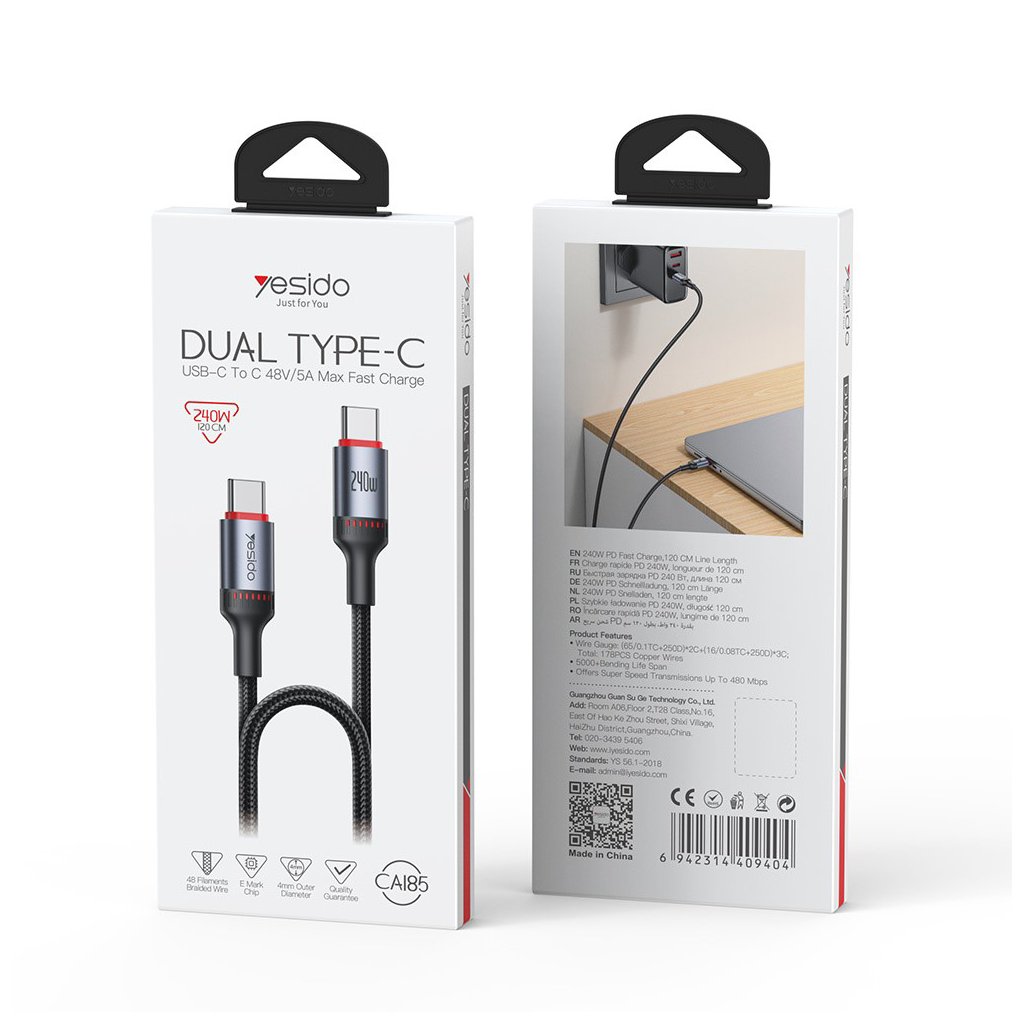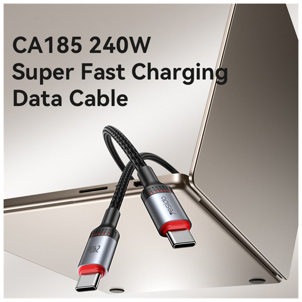 Kábel Yesido CA185 sa pýši moderným a funkčným dizajnom. Je vyvedený v čiernej farbe a jeho povrch tvorí odolné opletenie z 48 prameňov, ktoré efektívne zabraňuje zamotávaniu a predlžuje životnosť kábla, chránia ho pred roztrhnutím. Kovové konektory Type-C v elegantnej striebornej farbe sú opatrené výrazným červeným akcentným krúžkom, ktorý dodáva káblu šmrnc a uľahčuje orientáciu. Jeden z konektorov nesie logo značky Yesido, zatiaľ čo druhý je označený údajom "240W", zdôrazňujúcim jeho vysoký nabíjací výkon. Zosilnené spoje medzi káblom a konektormi ďalej zvyšujú jeho odolnosť proti opotrebovaniu pri každodennom používaní.