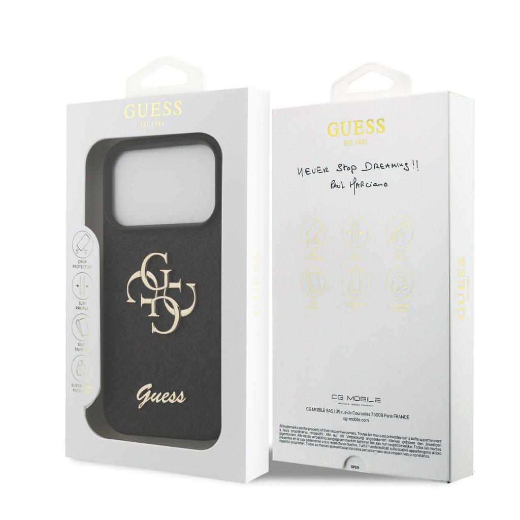 Zadný kryt Guess PU pevný s trblietkami 4G s kovovým logom pre iPhone 17 Pro, čierny