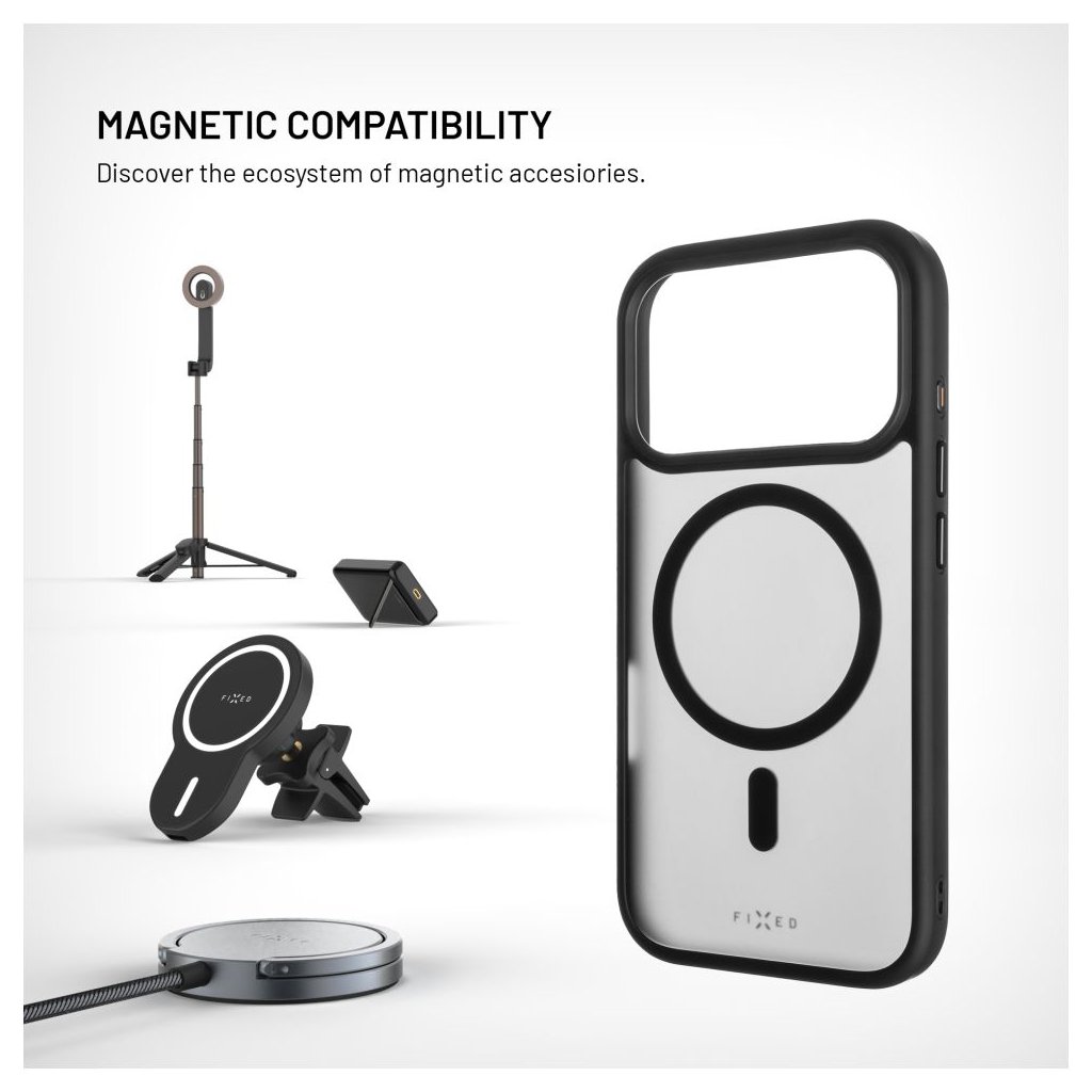 * **Typ produktu:** Zadný kryt * **Model:** MagMisty * **Kompatibilita:** Apple iPhone 17 Pro * **Farba:** Čierna * **Materiál:** Odolný polykarbonát (PC) a pružné TPU boky * **Podpora MagSafe:** Áno, integrované magnety N52 pre stabilné uchytenie * **Dizajn:** Matný vzhľad s dymovým efektom * **Ochrana:** * Zvýšené hrany pri displeji * Zvýšený rámček fotoaparátu * Mierne vyvýšené rohy na zadnej strane * 360° ochrana proti nárazom, poškriabaniu a nečistotám * **Funkcie:** * Kovové krytky tlačidiel * Protišmykový povrch príjemný na dotyk * Presné výrezy pre reproduktory, nabíjací konektor a fotoaparát * Kompatibilný s MagSafe a Qi2 bezdrôtovými nabíjačkami * Kompatibilný s ochrannými sklami Doprajte si s krytom FIXED MagMisty kvalitnú ochranu aj pohodlie pri každodennom používaní. Nečakajte a zaobstarajte si tento štýlový kryt ešte dnes, aby váš iPhone 17 Pro bol nielen chránený, ale aj vyzeral skvele!Dodatočné parametre