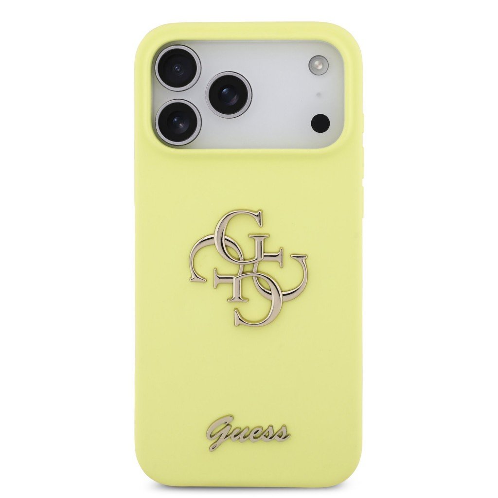 Originálny zadný kryt Guess Liquid Silicone 4G s kovovým logom, navrhnutý pre model iPhone 17 Pro Max v žltej farbe. Kombinuje mäkký pocit silikónu s prémiovým dizajnom a ochranou telefónu.