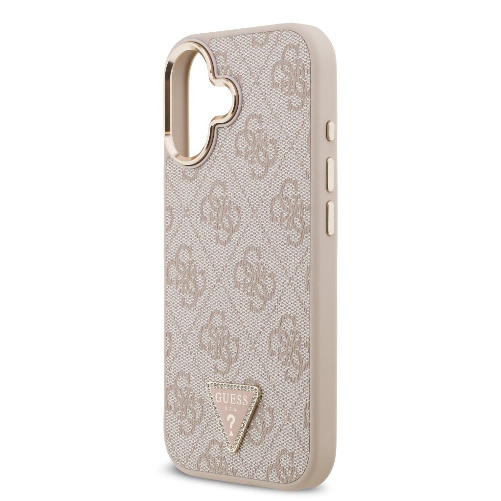 Krátky popis: Elegantný zadný kryt Guess v ružovej farbe s PU koženým povrchom, zlatým rámikom a 4G Triangle logom. Kompatibilný s MagSafe pre pohodlné bezdrôtové nabíjanie a presné uchytenie na iPhone 17.