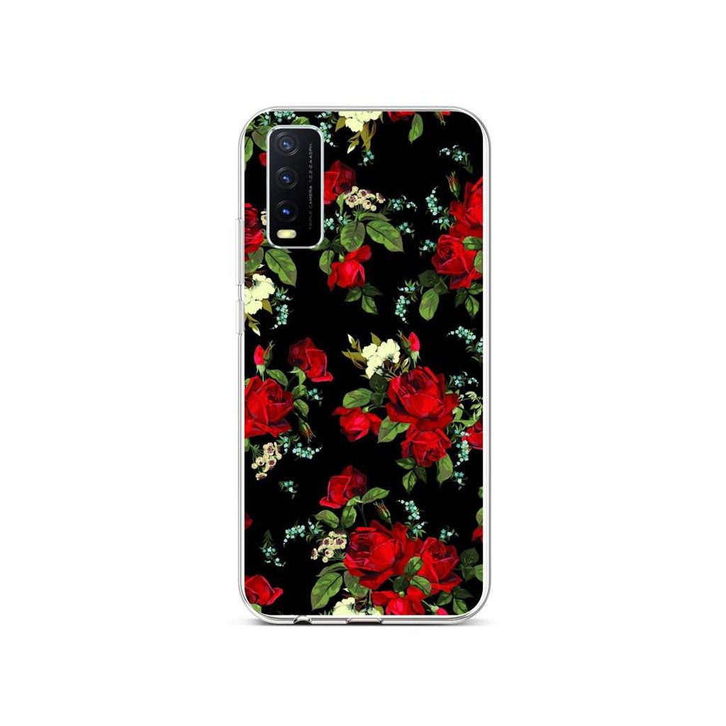 Originálny silikónový kryt na mobil Vivo Y20s s motívom červených kvetov ruží na čiernom pozadí. Kombinácia štýlu a účinnej ochrany v kvalitnom prevedení.